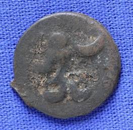 | Description / विवरण | The shape of the coin is circular. Obverse Kushana type king, standing with his right hand curved upward and his left hand extended slightly curved downward. Reverse Probably the figure of MAO or Moon-God with his right hand curved upward and the crescent above the left shoulder. |