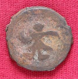 | Description / विवरण | The shape of the coin is circular. Obverse Kushana type king, standing with his right hand curved upwards and his left hand extended slightly curved downwards. Reverse Probably the figure of MAO or Moon-God with his right hand curved upwards and the crescent above the left shoulder. |