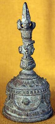 | Description / विवरण | The bell consists of a one moulded rim base. Above it , there is a row of thunderbolts touching one another. The vertical portion of the body is consist with four beaded wavy garlands, within the garlands there are four symbols are depicted, i.e thunderbolt in east, jewel in south, eight-petalled lotus in west , and sword in north. The vertical portion of the bell is consists of a full-blown lotus, a purna- kalasa , neck of a head wearing ear ornaments and a short crown. The head supports a flower base which is crowning a four edged spear head. |