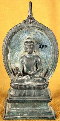 | Description / विवरण | Buddha is standing in sama-pada pose over a lotus pedestal. His right hand is in Abhaya mudra and left hand is holding an indistinct object. He is wearing waist garment with ends falling on two sides, anklets, bangles, arm-lets, necklace and a conocal mukuta with three leaf shaped components. In front side of the pedestal , there are two lions facing each other. |