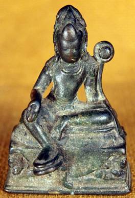 | Description / विवरण | The image is seated in lalitasana pose on a single molded lotus pedestal. His left hand is holding a lotus stalk while the right palm displaying the varada mudra, rests on the knee. He is crowned with jata-mukuta and a sacred thread. He is wearing a long antariya , and a folded uttriya tied around the thighs and end of the uttariya hangs from the left knee. In the front side of the pedestal, two lions are depicted. In the back side of the pedestal, there is a inscription. |