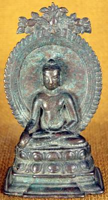| Description / विवरण | Buddha is seated in Bhumisparsa-mudra on a two moulded double petalled lotus pedestal. His hair is arranged in usnish style with an elongated ends. Behind the image there is an oval halo with leaf designed margine. At the centre of the halo, there is branches of tree is depicted. A dharini is engraved at the back side of the halo. |