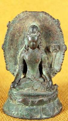 | Description / विवरण | The two armed Bodhisattva is seated in padmasana on a double petalled lotus pedestal. His right palm is in varada mudra, placed over the knee, while the left palm holds a stalk of flower placed over the left knee. A solid oval halo with a bedad boarder edged by tongues of flames at long intervals, is fixed on the back sides of image. His hair is falling over the shoulders. |