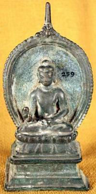 | Description / विवरण | Manjushree is seated in lalitasana over a single moulded double petalled lotus pedestal. His right palm is resting on the knee is in Varada mudra and left hand is holding the lotus stalk supporting a book over the pedestal. He is wearing ear-rings, anklets, valayas, armlets, and a short crown with tringular projections. At the back of the iamage there is circular Pravamandala with a leaf designed margin. |