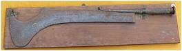 | Description / विवरण | It has a very heavy, single edged blade, much incurved and widening greatly at the end. The blade is decorated with tringle and floral designs. The wooden hilt has a circular grip and a iron tang button at the end. |