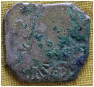 | Description / विवरण | The coin is known as the Kosala or Janapada type of Punch-marked Coin. The shape of the coin is square. Obverse The symbols of sun, river and branch of tree. Reverse Two tiny symbols are obscure due to silver sulphite formation on the surface of the coin. |