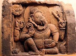 | Description / विवरण | The four armed Ganesha is seated in Ardhaparyanka pose. He is adorned with Jata mukuta, yajnopavita, necklace, armlets, wristlets and anklets. A snake is going round on his belly and right leg. A plain halo is carved on his back. He holds flower in upper right hand and Japamala in lower right hand where as Parsu in upper left hand and Modak-Pot in lower left hand. A circular lotus is carved on the upper right corner. |