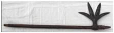 | Description / विवरण | Battle axe contains a single-edged concave blade attached to a long wooden handle. It is a cylindrical thin stick with a broad mouth. The blade is shown with four sharp points. The blade is balanced by a rectangular socket attached to this wooden handle. |