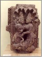 | Description / विवरण | The archaeological fragment showing the figures of Naga and Nagi in embracing posture. The theriomorphic figures have human features on their upper part, while their lower part forms coils of snakes. The coils of the two are elegantly entwined. The couple are found under the snake canopy. The figures are bedecked in the rich jewellery. |