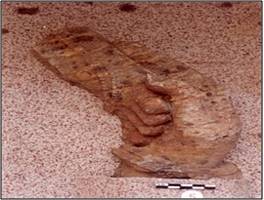 | Description / विवरण | The sculptural fragment depicts a plam of right hand supporting the left foot. The palm wears a bangle whereas the foot has an anklet. |