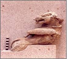 | Description / विवरण | The stylized lion vyala twists its body to look back wards. Its paws are placed in front of the chest. A long tongue prodrudes from its open mouth. It has horns, moustache and bulging eyes. |