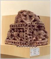 | Description / विवरण | The sculptural fragment a corner piece, within beaded borders depicts three infantries. On either side each. Each soldier carries a sword and a shield. On the top depicted two lions. |
