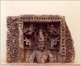 | Description / विवरण | The mutilated sculpture within beaded borders the bust of a deity with a top conical bejeweled crown. On the top corners are two flying vidyadhars. The figure is badly mutilated and eroded to describe and identify it. |