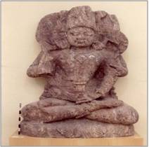 | Description / विवरण | The sculpture depicts four armed surya Narayan seated in padmasana pose with dhyanamudra. The image is richly bejeweled. Flames of fire issue from sides of his crown. The upper two hands of the image are broken. |