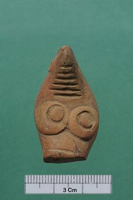 | Description / विवरण | Head of a serpent goddess. Round eyes and incised lines are shown here. |