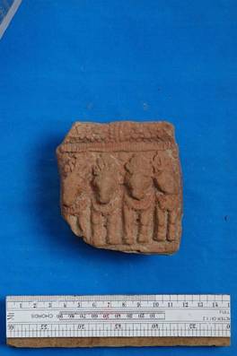 | Description / विवरण | Fragment wall of a toy chariot showing four standing bulls. |