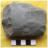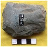 Bifacially flaked with marks of chipping along lateral margins. The margins are thick. Edge remains incomplete. The edge line is irregular. Marks of grinding on both the faces. Working edge is sharpened by secondary flaking all over. The section is relatively flat. The right margin is rolled and a number of notches are visible. It is concave on the ventral. Relatively flat on the dorsal surface.