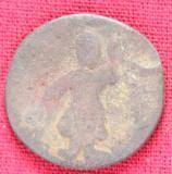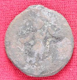 | Description / विवरण | The shape of the Coin is circular. Obverse -A Kushana type king standing with his right arm curved upwards and left arm curved downwards. Reverse -Probably, a standing figure of MAO or Moon-God with right arm curved upwards and the crescent above the left shoulder. The left arm is not visible. |