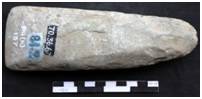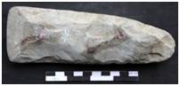 Flaked on both the faces with cortex covering the ventral surface. Bifacially ground on the edge retaining horizontal striation on the ventral. Edge line is straight. Margins are thick and slightly convex showing marks of chipping. Butt is thin and rounded. Oval in longitudinal cross section. It is slightly concave on the ventral. The dorsal remains uneven.
