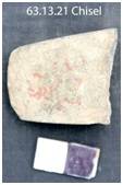 Chipped all over with marks of pecking on the ventral surface. The ventral surface is slightly convex and dorsal remains flat. Margins are thick and tapering towards the butt. Butt is thin, sharp and convex.