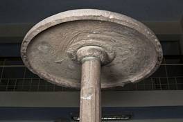 | Description / विवरण | The large stone parasol (originally part of AM no. 205) is in the image of a lotus on a stalk, the petals of the flower being carved around the socket where the shaft of the column meets the parasol. The shaft is damaged, but tapers towards the top; it is sixteen-sided in the lower portion, and circular above. It is not known whether the chatra was found with the image. Object is in two separate parts A and B which are attached together. The circular mortice of parasol has a lotus decorations along its raised border column is damaged, broken in two parts but joined by cement. It is sixteen sided on lower side and circular above. |