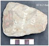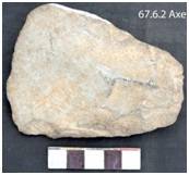 Both the faces are flat and partly ground. Dorsal surface is flaked on the ventral half and along right lateral margins. Edge is median and bifacially ground showing used damage. Blade is convex. Butt is thick with irregular polls. Biconvex in median and triangular in longitudinal section.