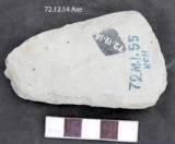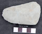 Roughly ground on both the faces showing flake scars along the lateral margins. Butt is thin and rounded on the tip. The working end is thick and asymmetrically convex with marks of battering. Elliptical median section. Biconvex in longitudinal section.