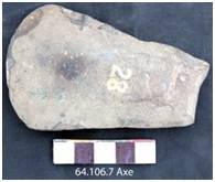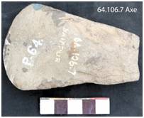 Partly ground on both the faces with marks of chipping on the upper half and alternately along the lateral margins. The margins gradually taper towards the butt. The ventral surface is convex and dorsal is flat. Edge is symmetrically convex and beveled. The tool retains used marks.