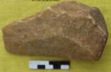 Elongated in form. Worked on both the faces. Dorsal is convex and fully flaked by a big and flat scar. Several small and shallow scars at the right side and deep steps along the left. A deep mid-ridge in the posterior. Unworked thick butt. Ventral has three longitudinal scars. Elongated anterior. Tip is broken with short margin. Plano-convex in median section. Triangular in longitudinal sections.