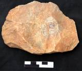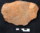 Dorsal is flaked all over. The scars are bold, big and flat. Ventral is a primary flake surface with bulbs at two ends. Left margin is thick. The right margin is thin and sharp. It is slightly concave in the dorsal and the ventral is flaked on the body and towards the cutting edge. A patch of cortex is noticed on the ventral near the platform. The tool is used and retains notch marks in the right margin of the tool.