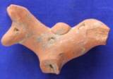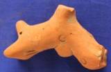 A well modeled animal figurine probably a bull dog. Eyes are indicated by incised pellets and nostrils by holes. Long face with prick ears. Circular punches and vertical lines all over the body. Four legs are missing.