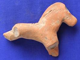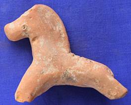 Model of an animal figurine probably a horse. Nostrils are represented by holes. Row of circular punches and oblique lines over the body. Three deep horizontal lines on the neck. Four legs and ears are missing.