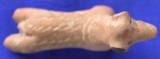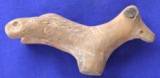 A well backed handmade animal figurine. The eyes are indicated by incised pellets and nostrils by holes. Ears are mutilated. Five rows of oblique lines over the body and two horizontal lines on the neck. Hind right leg bear a pin hole and the rest three legs are missing.