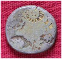 | Description / विवरण | The coin is an imperial type of Punch- marked Coin. The shape of the coin is circular. Obverse Sun, caduceus, tree, Six armed wheel and other symbols are defaced. Reverse Blank. |