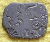 | Description / विवरण | The coin is imperial type of punch marked coin. It is irregular in shape. Obverse Sun, six armed wheel, five arched hill, bull, elephant, taurine, moon. Reverse Minute symbol. |