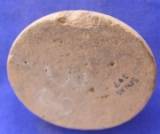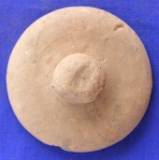 It is a terracotta lead. A rounded knob at the top portion. Base portion is flat. Edge of the base portion is slightly broken.