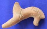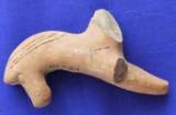 | Description / विवरण | Model probably of a horse. The eyes are indicated by incised pellets, and nostrils by holes. It has a long neck. Row of circular punches and oblique lines all over the body. Two deep horizontal lines on both the sides of the neck. The frontal and hind left legs are missing. |