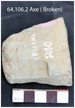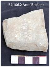 The axe is broken. The sides are flaked and retain deep flake scars. It is slightly concave and retains used marks in the left margin of the tool. The tool is broken half. The tool is sharpened from both the sides with removal of small flake scars.