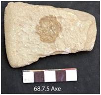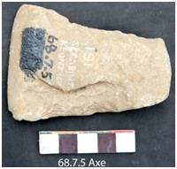 Made on a flake and is flaked on upper edge. Left margin is concave with alternate flaking. Edge is bifacially ground, slightly convex in appearance. Butt is narrow and straight. Nearly lenticular in longitudinal and elliptical in median cross section.
