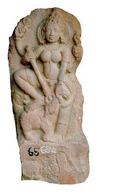 | Description / विवरण | Standing Durga as Mahishasuramardhini with four hands. Head dress is jatamakuta with patra and makara kundalas to the ears. The two rear hands hold ankusa and pasa. The front right hand holds a trident placed on the head of the buffalo, while the left rests on her lap. The right leg is raised up and kept on the back of the Buffalo, while the left hangs down freely and rests on the pitha. Decoration includes a thin necklace, keyuras and armlets. The lower part has drapery in the form of a dhoti which falls below the knee level. A halo behind the head is seen prominently. On the hind side, at the foot is faintly seen a lion suggesting Simhavahini Durga. |