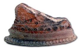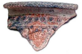 | Description / विवरण | Broken piece of red ware storage jar with splayed out thickened rim and nail pinch design, lotus medallion in between two lines below the neck, below it is a box type of design, in one of the boxes is shown a male and female figures sitting opposite to each other holding mirrors in their hands and attending to their toilet. |
