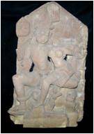 Image of Uma-Mahesvara in Alingana mudra seated on kailasa. Siva has four hands, Both right hand is not survived. The upper left hand holds a serpent and lower left hand touches the breast of Parvati. Head, left leg and both hands of parvati are missing. Siva s head is partly damaged. Below the seat Nandi bull and simha are shown in between a male figure are also shown. To the left on bottom image of Ganesa in standing position. His tusk in chipped off.