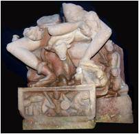 It appears to be seated Siva and Parvati image which retains only the waist portion. All hands of Siva and Parvati are not survived. Below the seat Nandi bull and Simha are shown in between a seated male figure is also shown. To left kumara is depicted in standing position with his spear and near the feet of him a seated male figure is shown. Below the Pada-Peeth depicting Ravnanugraha.