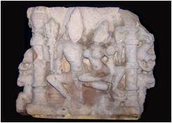 Within the two pilaster, the alingana murti of Uma-Maheswara seated on Kailasa. Siva holds his upper right hand a trident left holds a serpent, the lower right hand holds a fruit and left hand is placed near the breast of Parvati. Her right hand is placed on the Siva s shoulder and left hand holds a mirror. The face of Siva and left hand s fingers of parvati are chipped off whereas right knee of Siva is also damaged. The upper portion of left pilaster and middle portion of the base is partly damaged. Outside the both pilasters, there are the depiction of vyala and Gaja which are partly damaged. The absence of Nandi and Simha are note worthy.