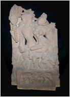 Uma-Maheswara in alingana mudra seated on kailasa. Siva has four arms-the upper right hand holds mutilated trident, lower is missing, the upper left hand is missing, lower is placed near the breast of Uma. Her right hand is placed on the shoulder of siva, other is missing. The face, and right leg of Siva and left leg of Uma are missing. The top portion is broken, only Sirsacakra survives. Near the Sirsacakra to the right side a small image of Brahma is shown. Near the pada- peeth to the right side, two armed male figure seated, right hand holds an indistinct object, and left hand holds a fruit. To the left side Ganesa is seated. Below the seat Bull and lion have been presented and in between a skeletal female figure is presented. Below it, a male figure holds a Danda like object followed by two kneeling male figures on the bottom of the Pada-Peeth two male figures are seated.