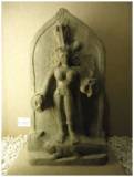 | Description / विवरण | The figure of Ganga is standing on her vehicle makara. She is two armed. In her right hand she holds a pot against a lotus medallion her left hand is holding a lotus stalk. A cobra with speared hood is coiled round her left arm. Her coiffure consists of neatly combed long tresses gathered over left shoulder in the shape of large sized bun. She wears a tiara, over which a tall snake canopy with three hoods is seen. For ornaments she is decked with large circle earrings, a number of necklaces of different designs. |