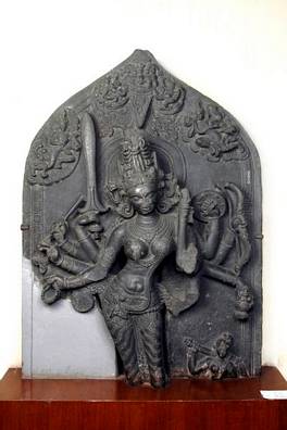 | Description / विवरण | A ten-armed Durga holding various attributes in the hands. The image wears a high headress and is elaborately ornamented. |