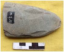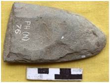 The tool retains a heavy patch of cortex with flaking marks on both the sides. The tip of the tool is notched. Roughly concave in shape. Heavy flake scars are noticed on the inner surface of the tool. Elongated in the cross section.