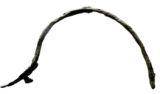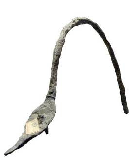 | Description / विवरण | A semi circular iron hanger handle made of thick rod. It has half moon shaped body with ends shaped into snout of a crocodile, which is nailed at its centre. The other end is broken. |
