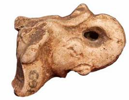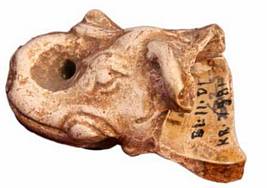 | Description / विवरण | Broken head of an elephant made of Chinese clay. It shows upraised trunk and a broken tusk. Ear lobes and eyes are shown prominently. |